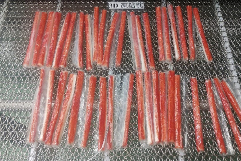 今回のカニカマのテストでは、「23℃から21分で急速凍結」することで、スポンジ化と乾燥を防ぎ、本物のカニのような繊維感とジューシーさを維持できることが実証されました。