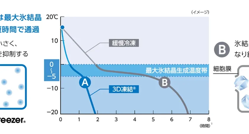 品質に効くのは最大氷結晶生成帯(-1〜-5℃)をどれだけ早く通過させるかです。家庭用は量が増えると帯の滞在時間が伸びやすいのに対し、業務用は短時間で帯を抜ける設計のため、解凍後の食感・ドリップで差が出ます。