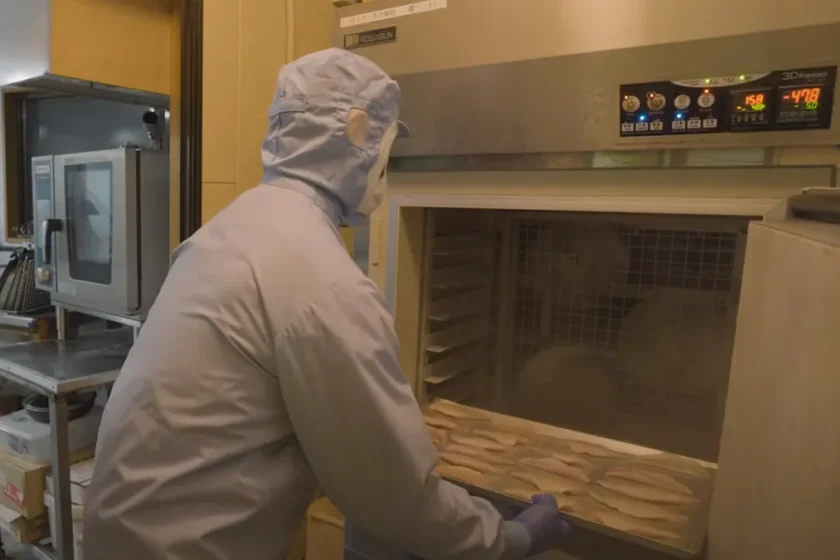 トレーに並べたキンパを3Dフリーザーに投入する作業風景|KOGASUN急速冷凍技術の導入事例