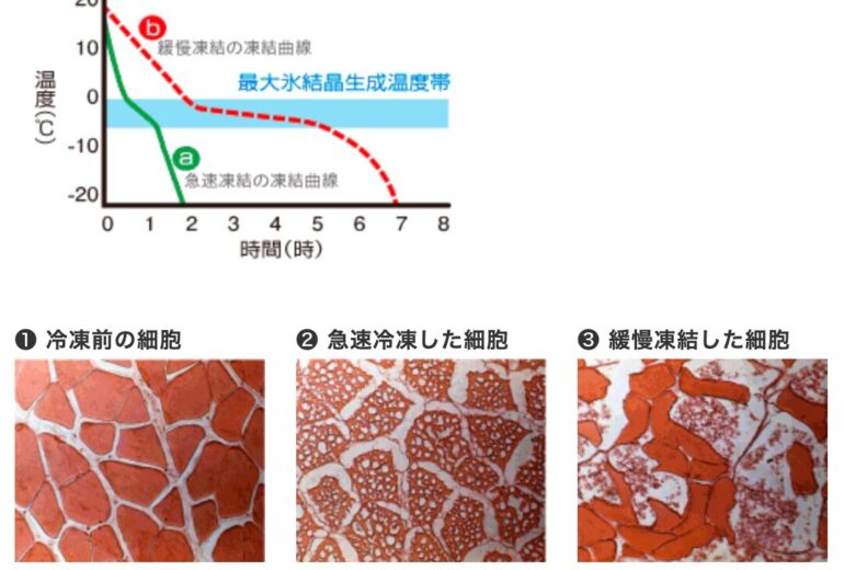 • 最大氷結晶生成帯(約-1〜-5℃)を短時間で通過すると、細胞破壊が抑えられ、解凍品質が安定。