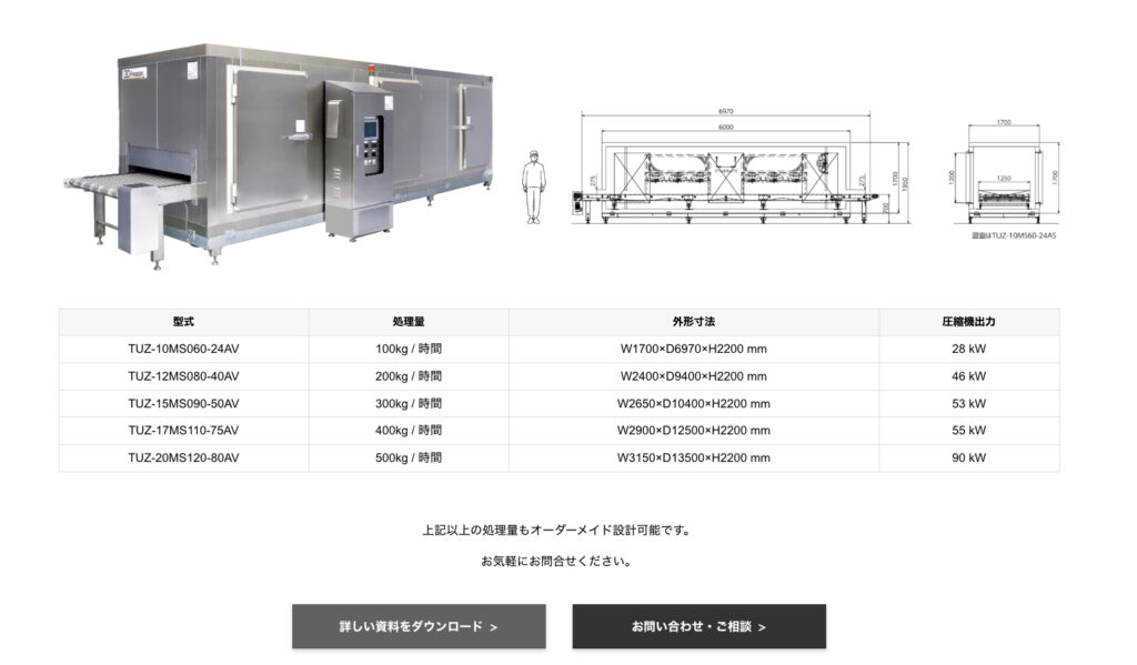 まず、「タカハシガリレイ」は、1961年にトンネルフリーザー®を開発したパイオニアとして知られています。長年の歴史と豊富な実績に裏打ちされた高い技術力は、多くの食品製造現場で信頼されています。すべてオーダーメイドで設計・製作を行い、タンク式ボディによる洗浄性・蒸気殺菌機能など衛生面に強みを持ちます。高風速ジェット型の独自ノズル技術も有しており、特に品質と衛生を重視する事業者にとっては頼りになる存在です。