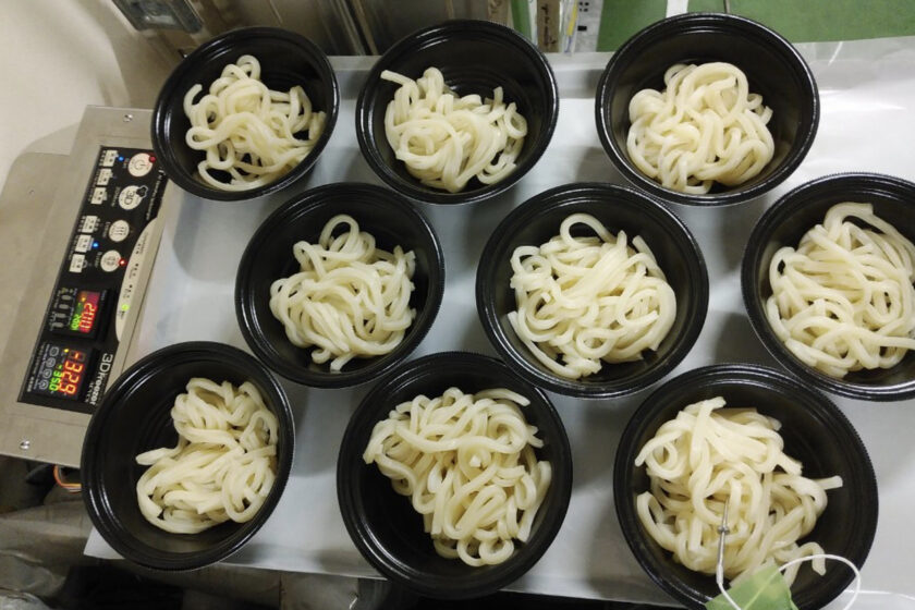 うどんのコシは、デンプンの糊化(アルファ化)状態によって決まります。 冷凍スピードが遅すぎるとデンプンが老化(ベータ化)して硬くなり、ボソボソとした食感になってしまいます。